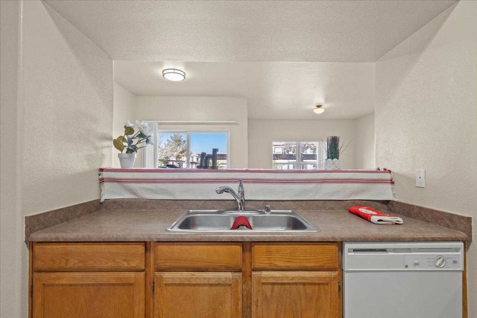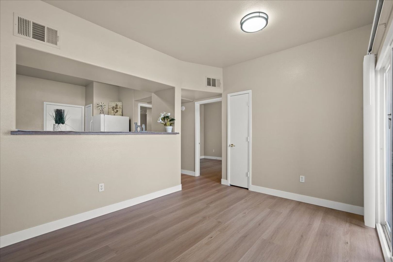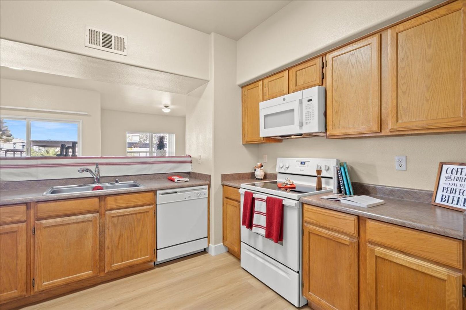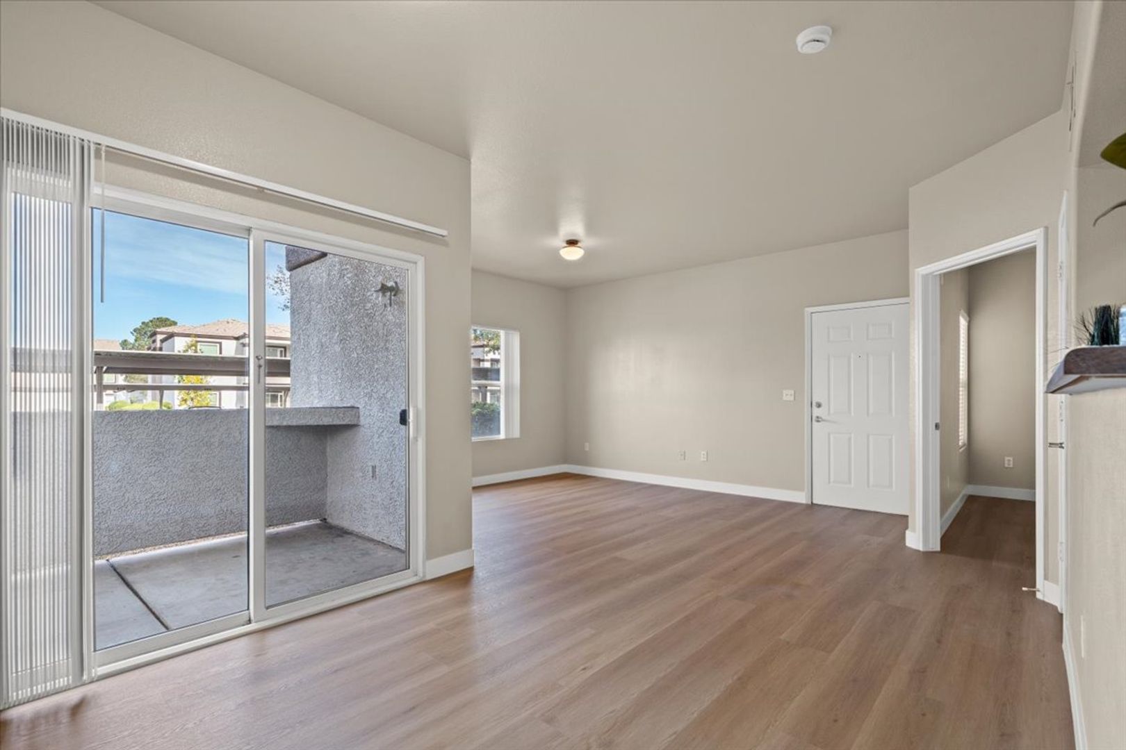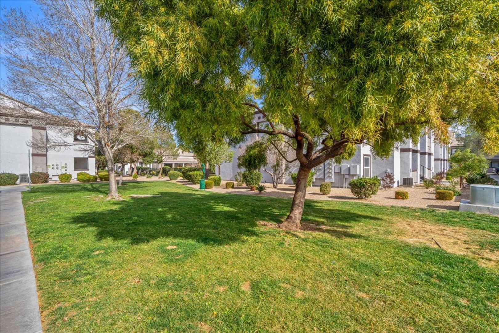 Step into comfort and convenience with this beautifully maintained first-floor corner unit, ideally situated just steps from the community pool. Located minutes from I-215, this home offers easy access to shopping, dining, and everything Las Vegas has to offer. Inside, you'll find a spacious open floor plan with two generously sized bedrooms positioned on opposite sides of the unit—perfect for privacy or guests. Stylish brand new wood laminate flooring flows throughout, complemented by blinds on every window for a clean, modern touch. This home is freshly painted and offers a large kitchen with new microwave, pantry, and breakfast bar. Enjoy morning coffee or evening relaxation on your covered patio. Community offers 2 swimming pools, play ground and plenty of space with artificial grass for pets.