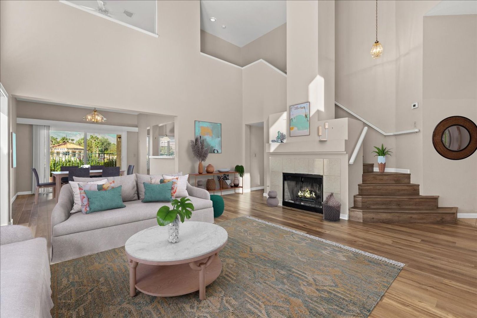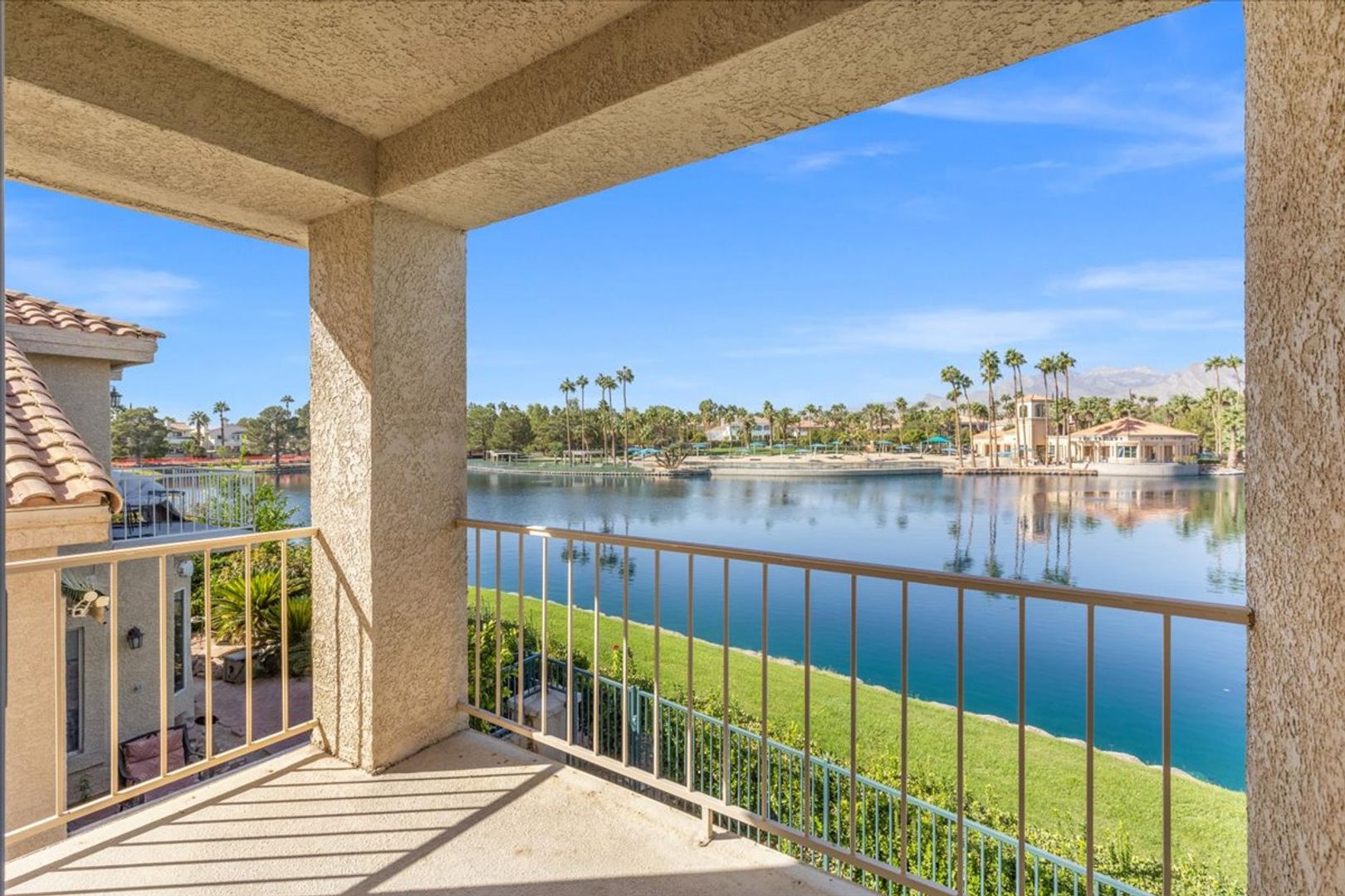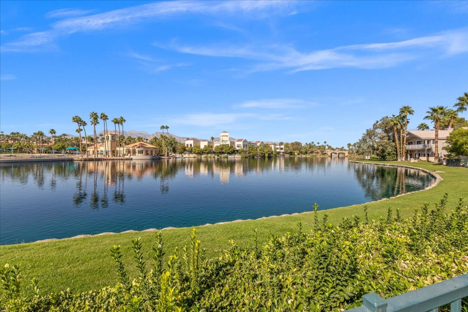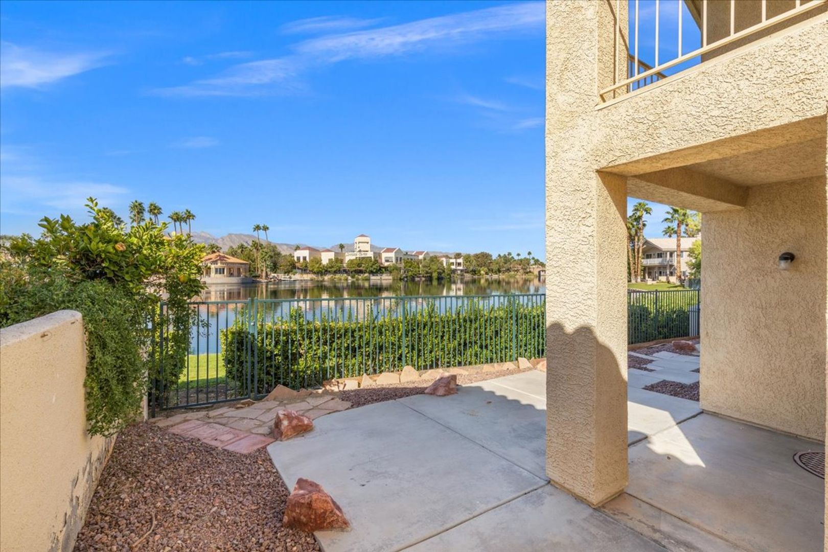 Located on the gorgeous lush banks of Lake Jacqueline in Desert Shores, this amazing floor plan boasts a downstairs owner's suite with views of the lake and an additional bedroom downstairs, the second owner's suite upstairs offering unique privacy, and a balcony with lovely stunning views of the lake. Roomy living area with vaulted ceilings featuring plantation shutters open to the dining room. The amazing sunsets reflected off the water will take your breath away! Incredible location with access to the lake and grounds ~ unique opportunity to live in 1 of the 60 lakefront homes. Come see this amazing home in the heart of beautiful Desert Shores that is ideally located close to restaurants, shopping and schools. The Racquet Club community offers a clubhouse, exercise room, pool and spa and courts all in a gated community.