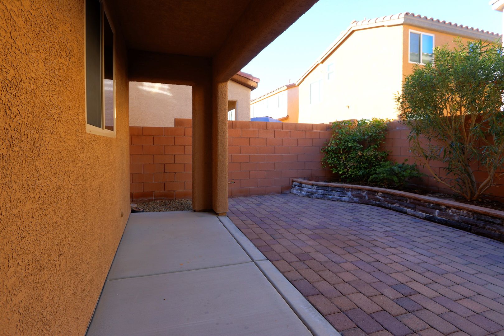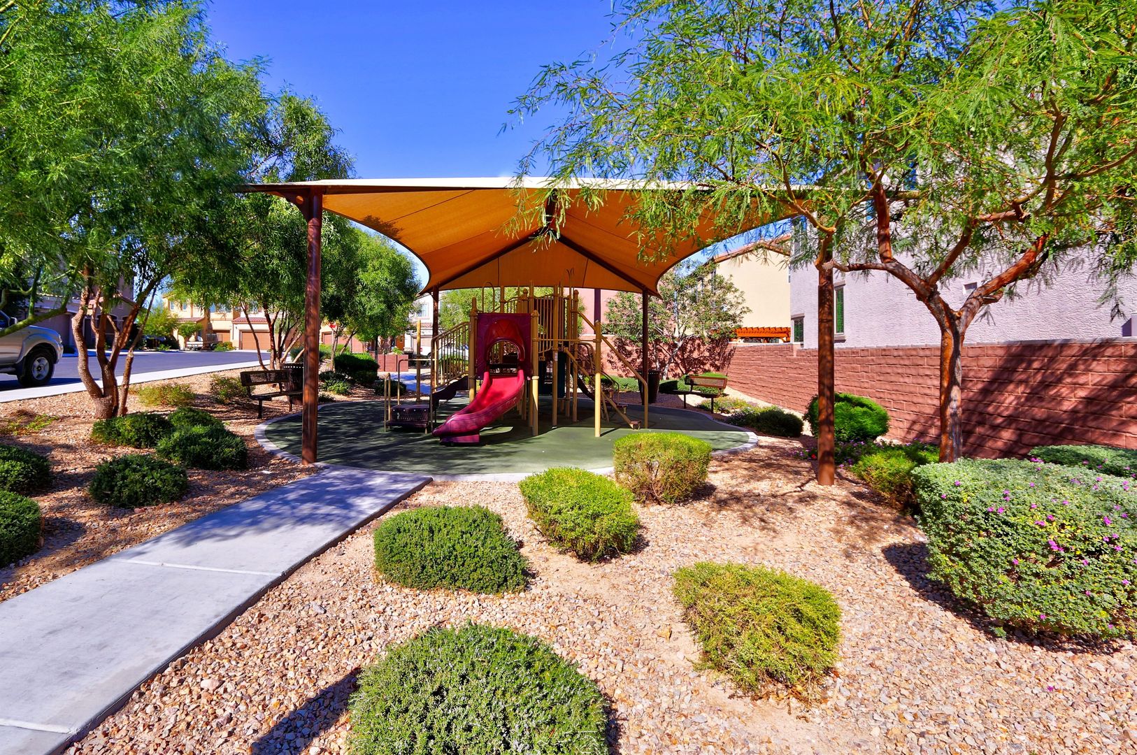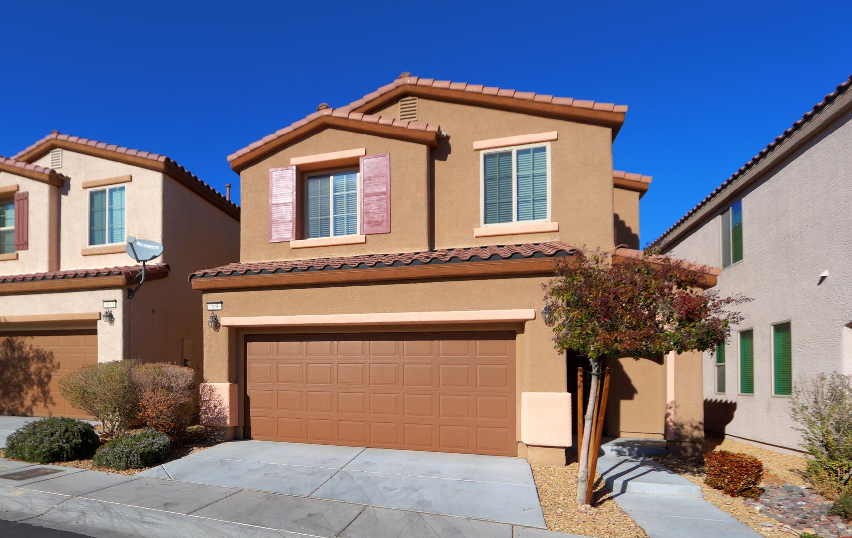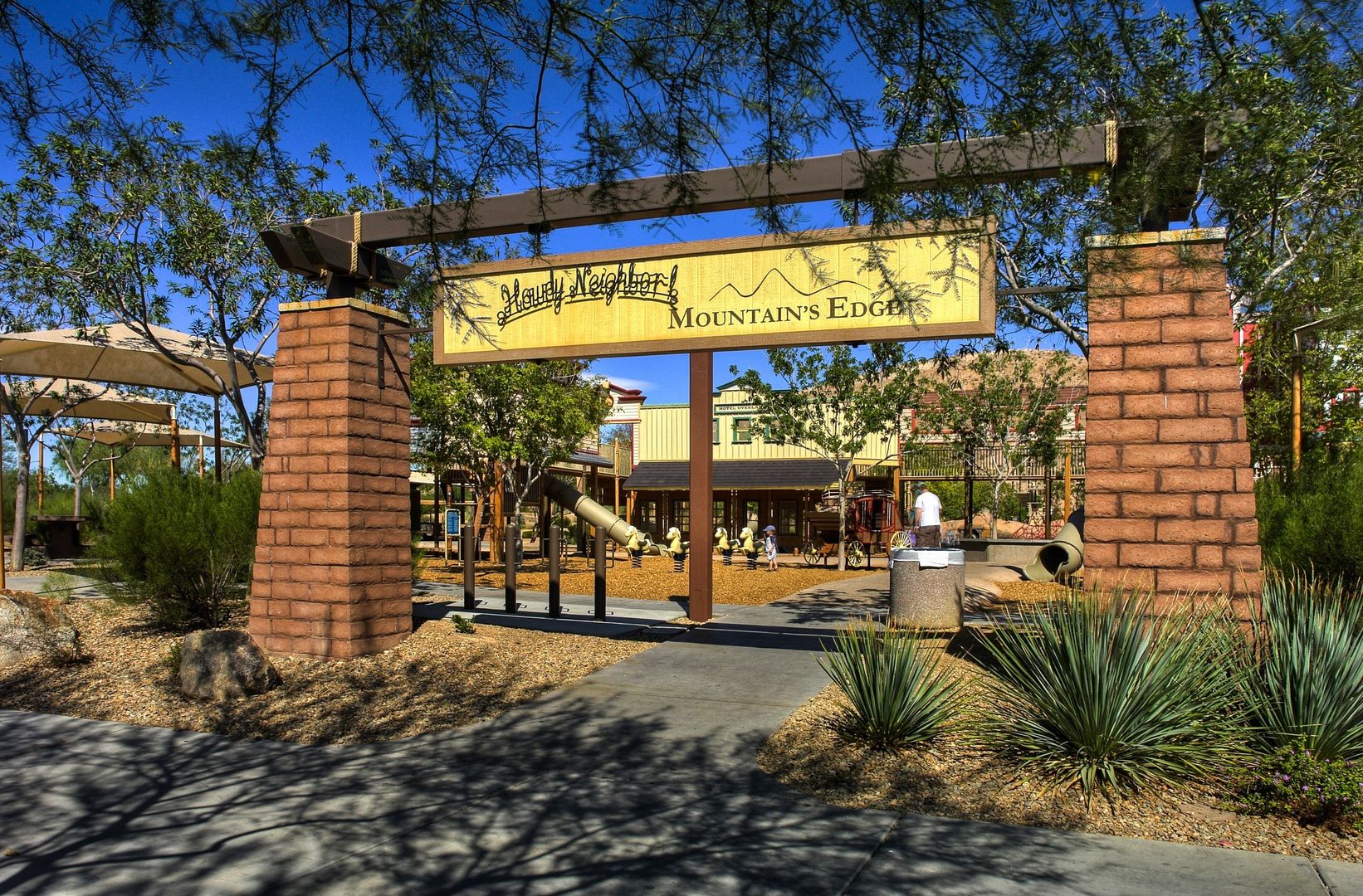 Terrific TWO STORY 3BDRs & 2.5BTHs HOME in Mountain's Edge. Entry reveals bright & open layout w/joined Family & Dining Rms enhanced w/neutral tile flooring. Galley style kitchen w/dark cabinets, granite cnts, backslash, black appliances & pantry. All BDRs are upstairs plus Laundry & built-in desk. Large MBD & en suite w/double sink, tub & separate shower. Finished backyard w/covered patio. Situated near community pool, park, walking trails & playground.