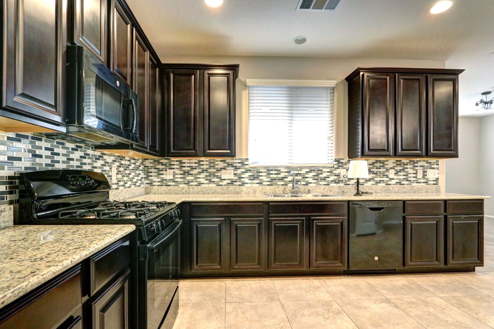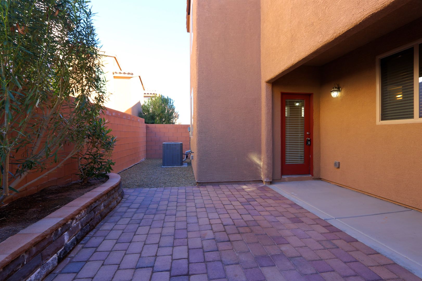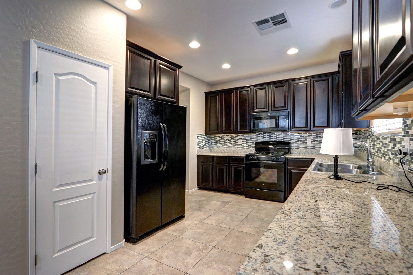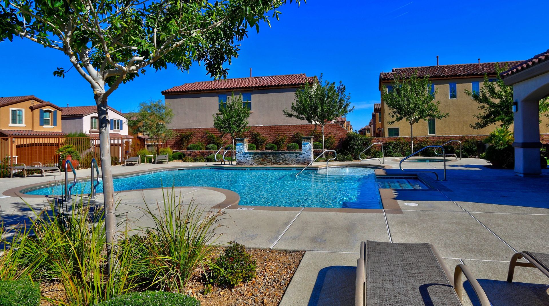 Terrific TWO STORY 3BDRs & 2.5BTHs HOME in Mountain's Edge. Entry reveals bright & open layout w/joined Family & Dining Rms enhanced w/neutral tile flooring. Galley style kitchen w/dark cabinets, granite cnts, backslash, black appliances & pantry. All BDRs are upstairs plus Laundry & built-in desk. Large MBD & en suite w/double sink, tub & separate shower. Finished backyard w/covered patio. Situated near community pool, park, walking trails & playground.