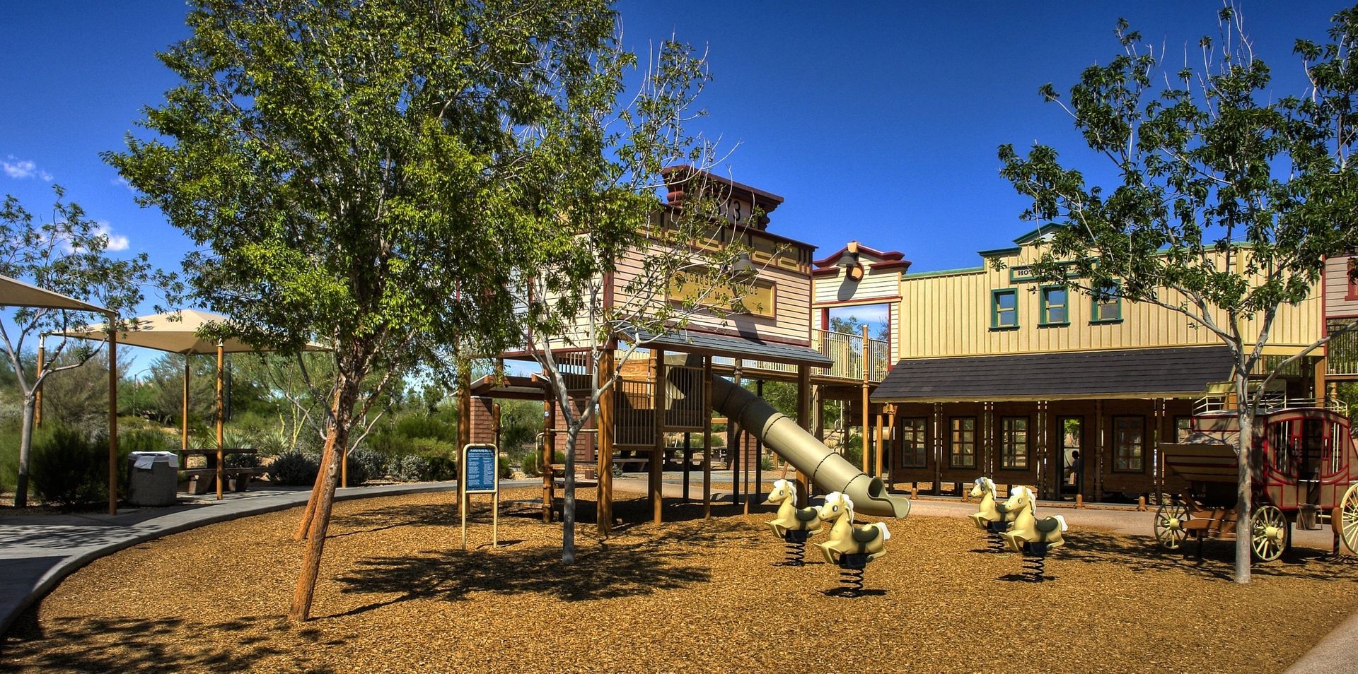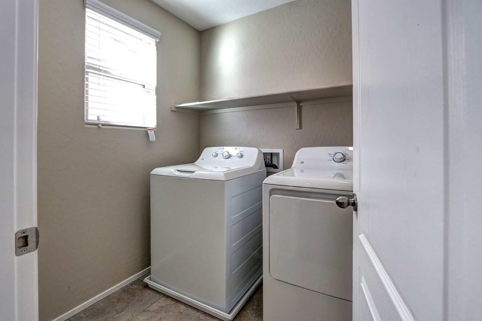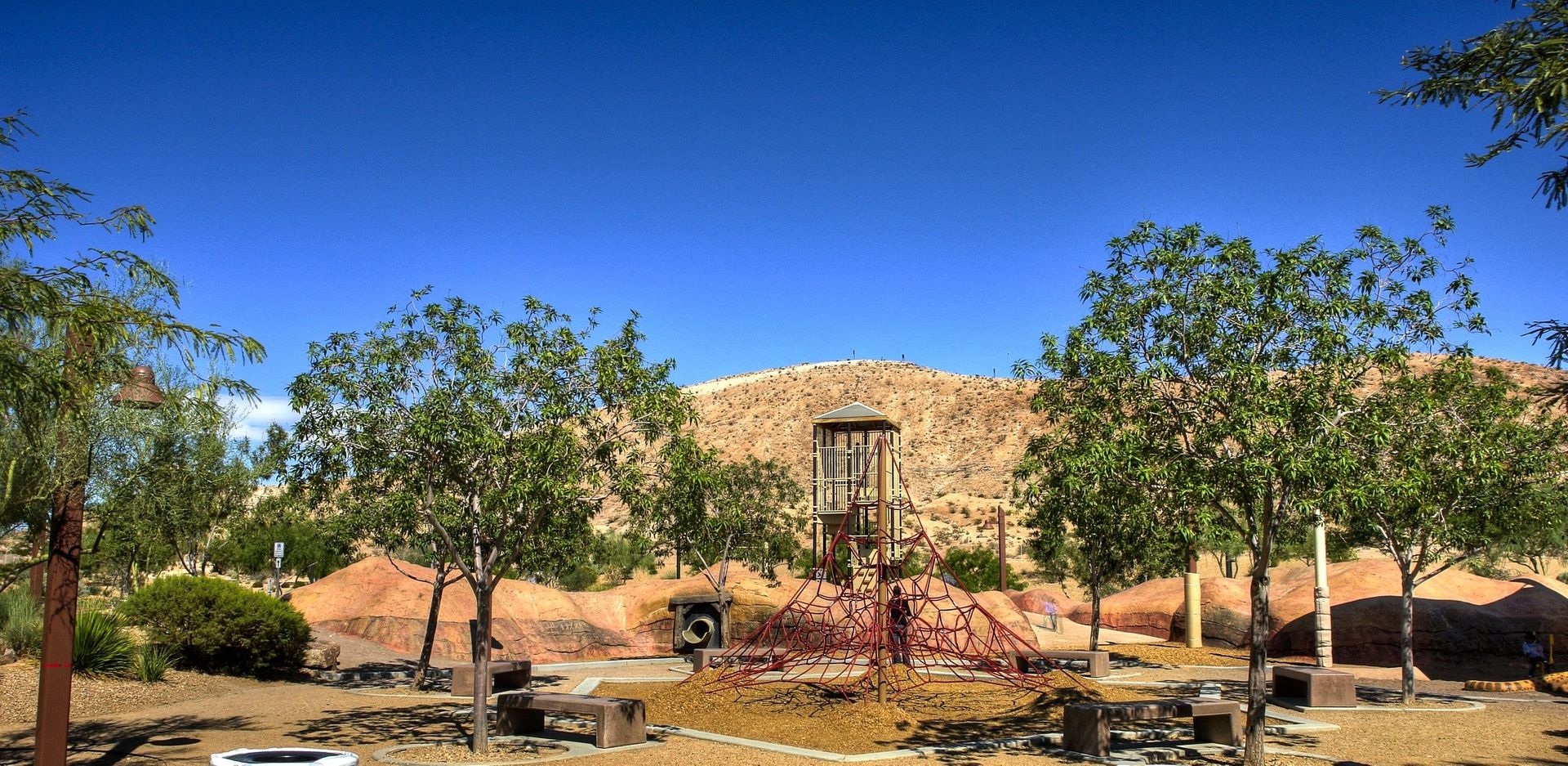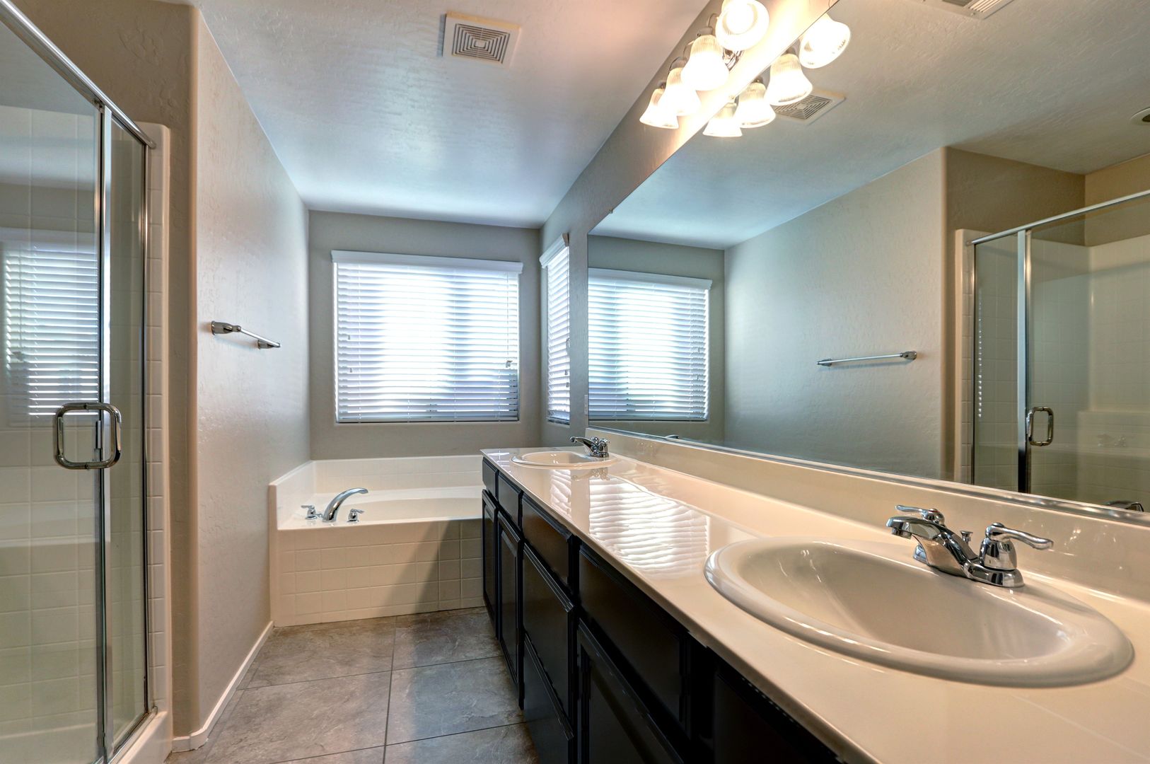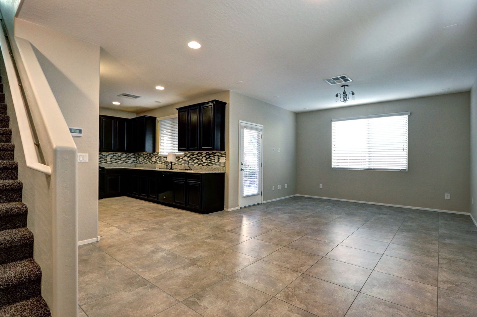 Terrific TWO STORY 3BDRs & 2.5BTHs HOME in Mountain's Edge. Entry reveals bright & open layout w/joined Family & Dining Rms enhanced w/neutral tile flooring. Galley style kitchen w/dark cabinets, granite cnts, backslash, black appliances & pantry. All BDRs are upstairs plus Laundry & built-in desk. Large MBD & en suite w/double sink, tub & separate shower. Finished backyard w/covered patio. Situated near community pool, park, walking trails & playground.