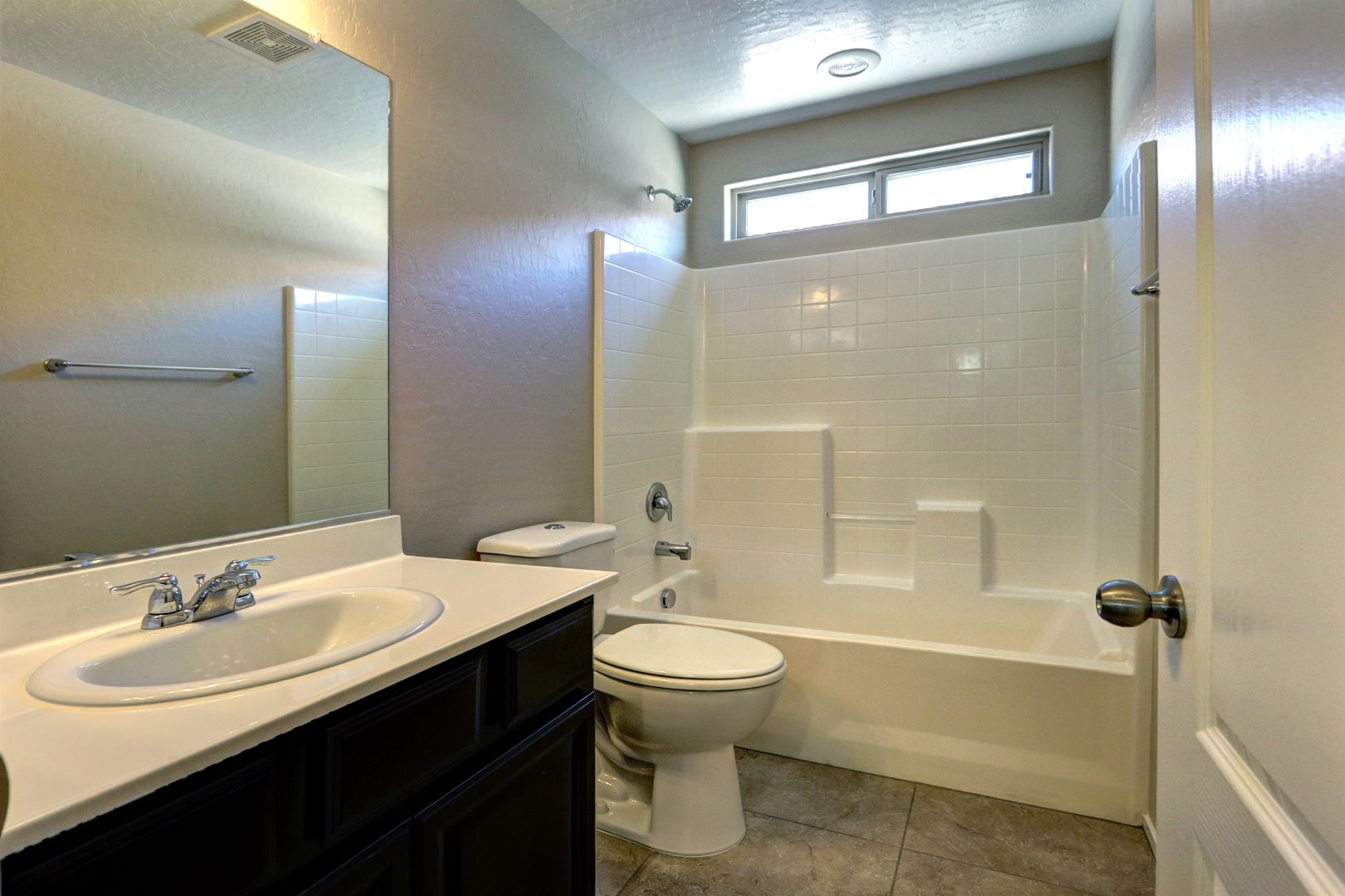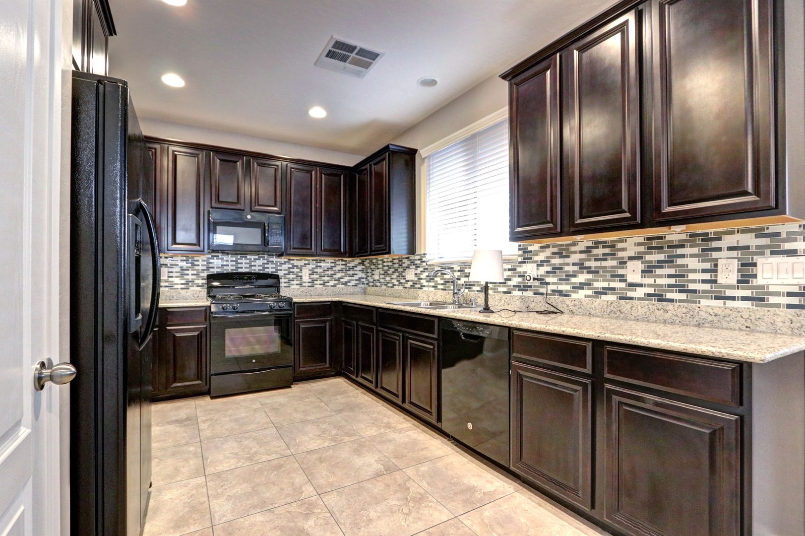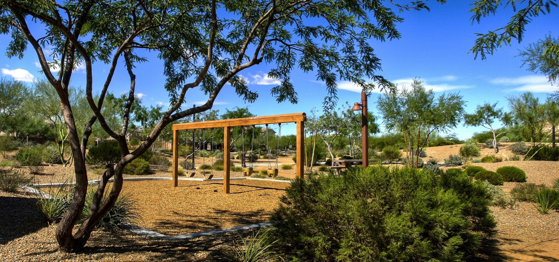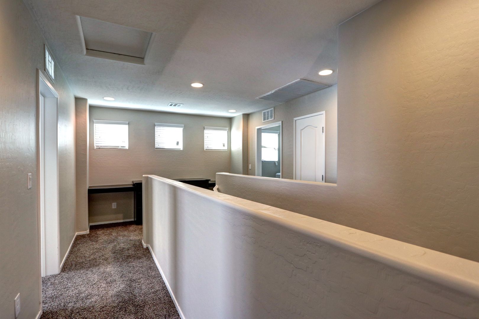 Terrific TWO STORY 3BDRs & 2.5BTHs HOME in Mountain's Edge. Entry reveals bright & open layout w/joined Family & Dining Rms enhanced w/neutral tile flooring. Galley style kitchen w/dark cabinets, granite cnts, backslash, black appliances & pantry. All BDRs are upstairs plus Laundry & built-in desk. Large MBD & en suite w/double sink, tub & separate shower. Finished backyard w/covered patio. Situated near community pool, park, walking trails & playground.